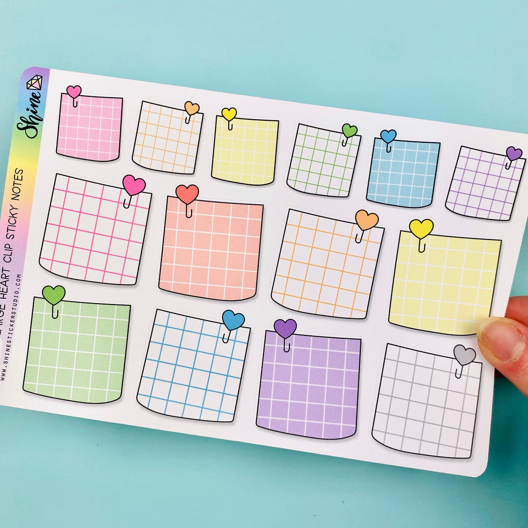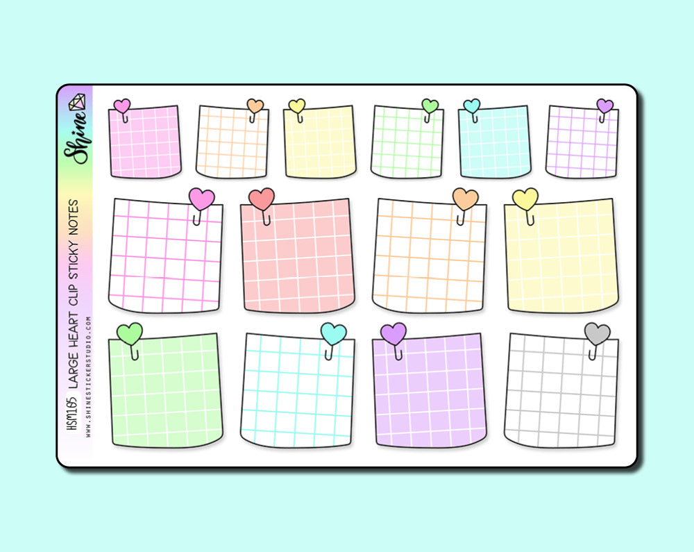 This listing is for a sheet of larger sized heart clip sticky note stickers in a variety of colors. The smaller ones are about 1" and the bigger are 1.5".