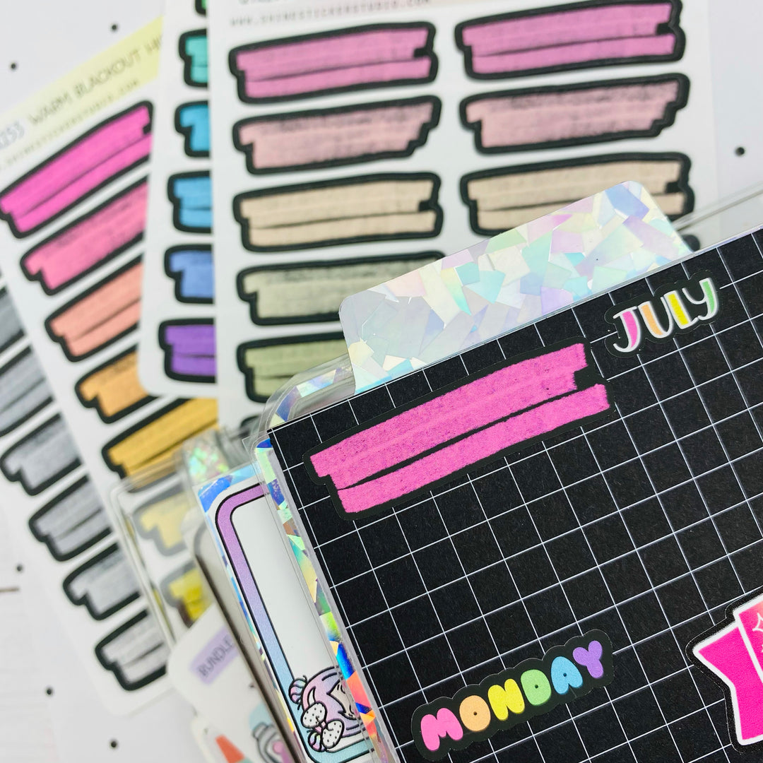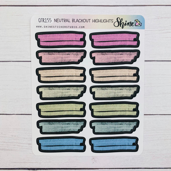 This listing is for one sheet of highlight stickers in our neutral color palette layered over black. These are perfect for blackout planning! Each sticker is approximately 1.5 x .5"