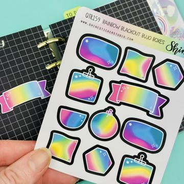 This listing is for one sheet of bullet journal doodled box stickers featuring a rainbow design layered over black. These are perfect for blackout planning!