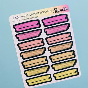 This listing is for one sheet of highlight stickers in our warm color palette layered over black. These are perfect for blackout planning! Each sticker is approximately 1.5 x .5"