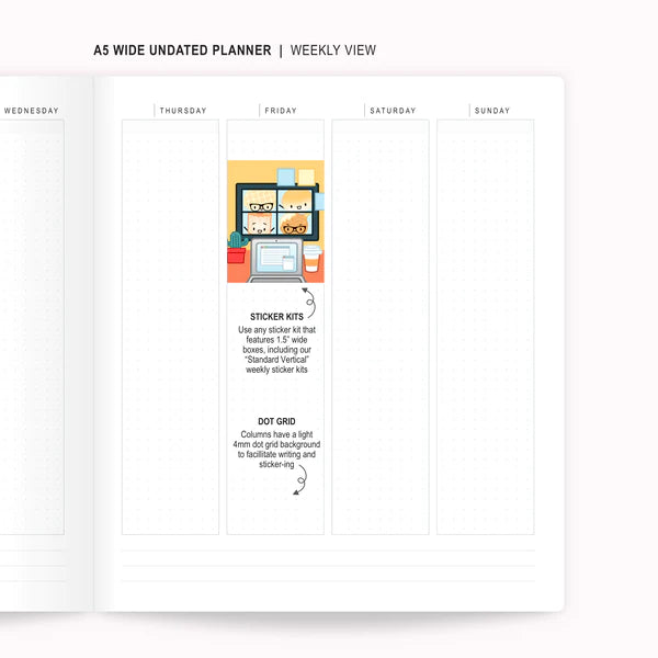 - Undated 6 months of 2-page monthly views at the start of the planner with 2-page weekly views featuring vertical daily columns that are 1.5" wide