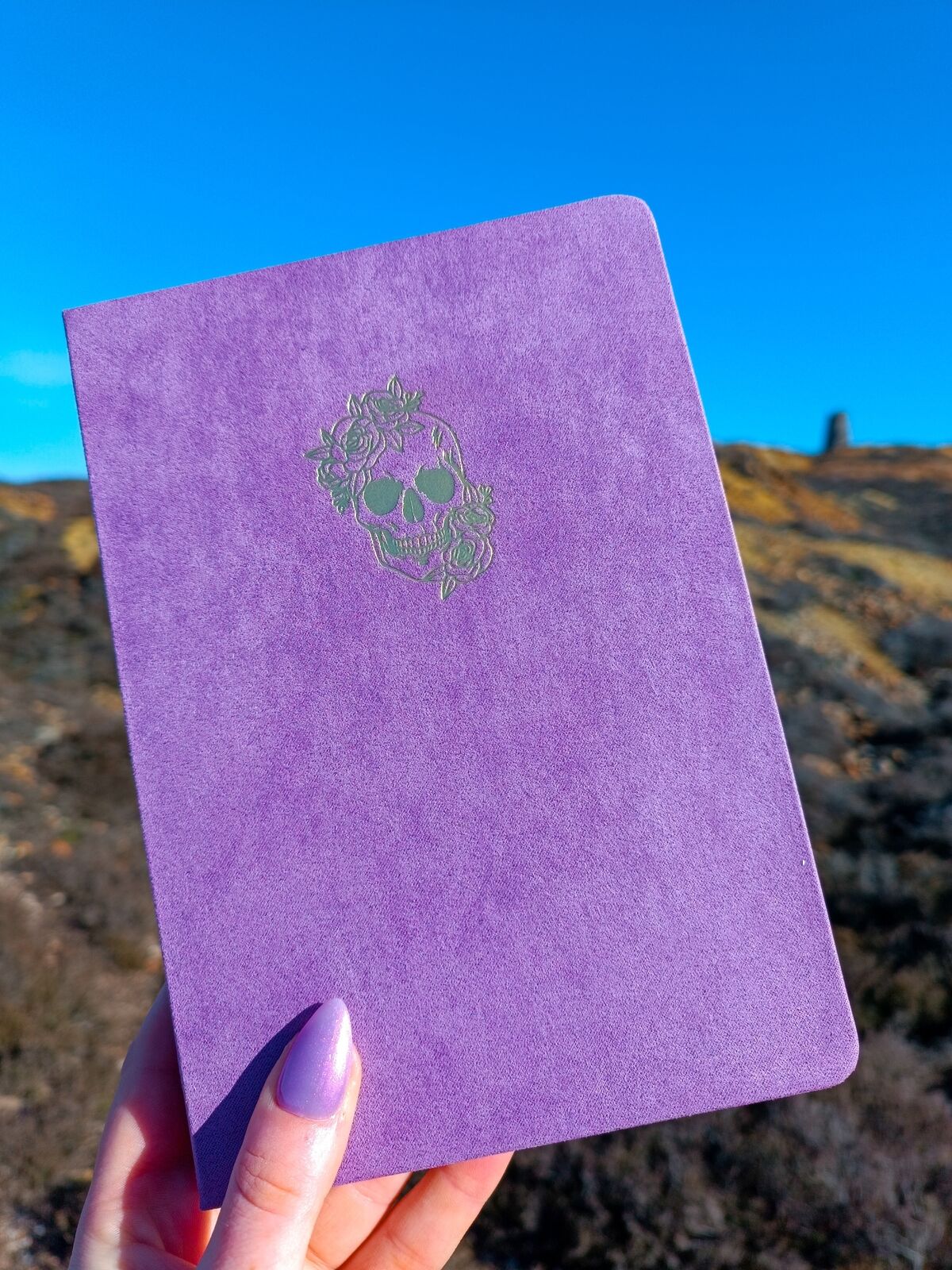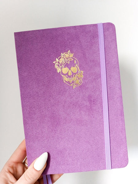 A beautiful purple A5 hardbound bullet journal with a gold foil floral skull debossed cover.