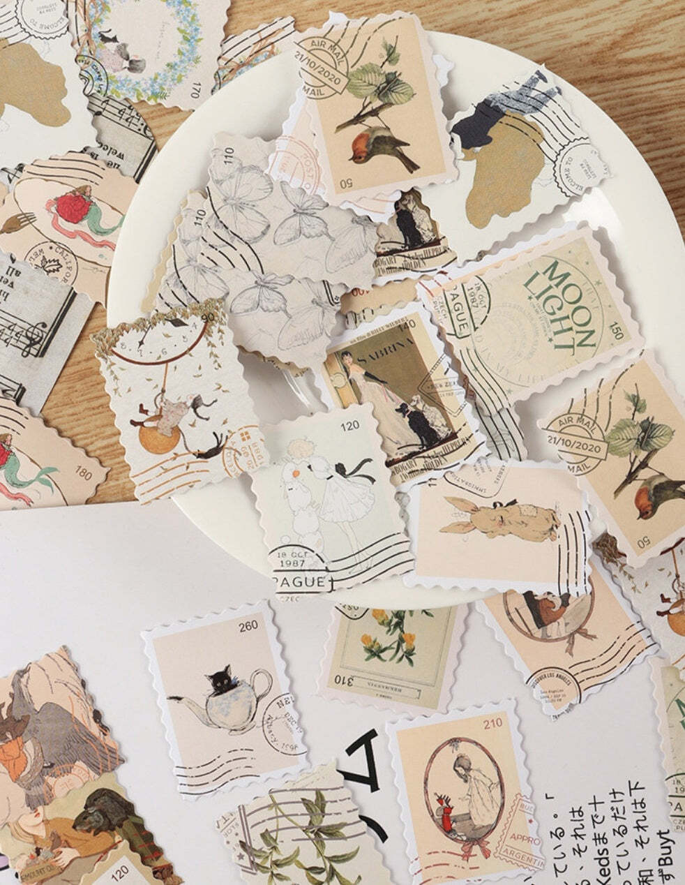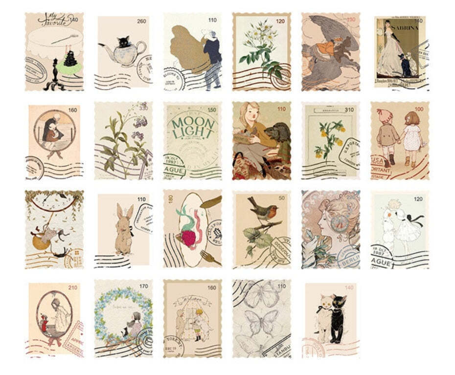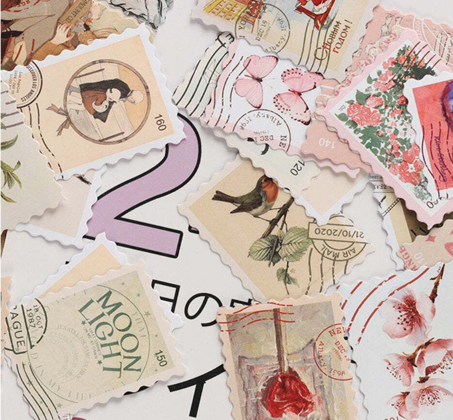 Spice up your planners, journals, scrapbooks, and crafts with these vintage-style whimsical stamp journal sticker flakes.