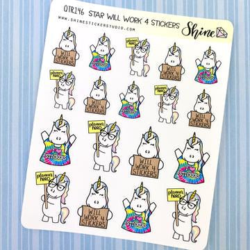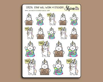 This listing is for one sheet of these adorable stickers featuring our hand drawn character, Star the Unicorn. Here she is holding a cardboard sign that reads "Will Work 4 Stickers", wearing a tie dye shirt with "I ❤️ Stickers", and holding a sign, "Planner Nerd" while wearing glasses. There are ten 3/4" tall stickers and eight 1" tall stickers. Ya gotta love Star