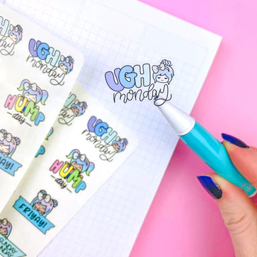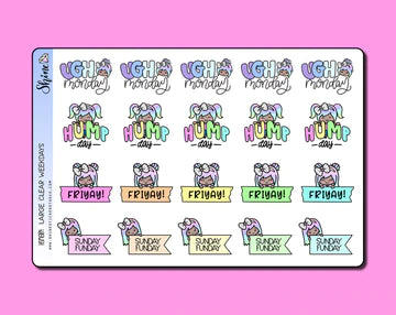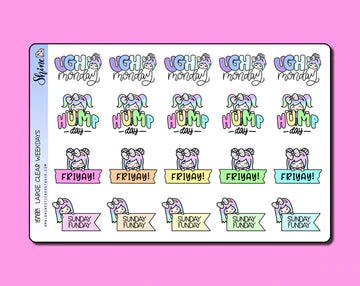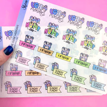 This listing is for a sheet of larger sized Luna Weekdays printed on our clear sticker paper. These are great for bullet journals and all types of planners and can be layered with other stickers, paper, washi, etc. Choose light or dark skin tone for Luna.