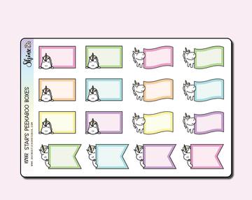 This listing is for a sheet of Star the Unicorn Peekaboo Boxes stickers, in three different designs, in our Shine pastel color palette. These boxes will fit in a standard vertical 1.5" wide box and you can write whatever you like in them.