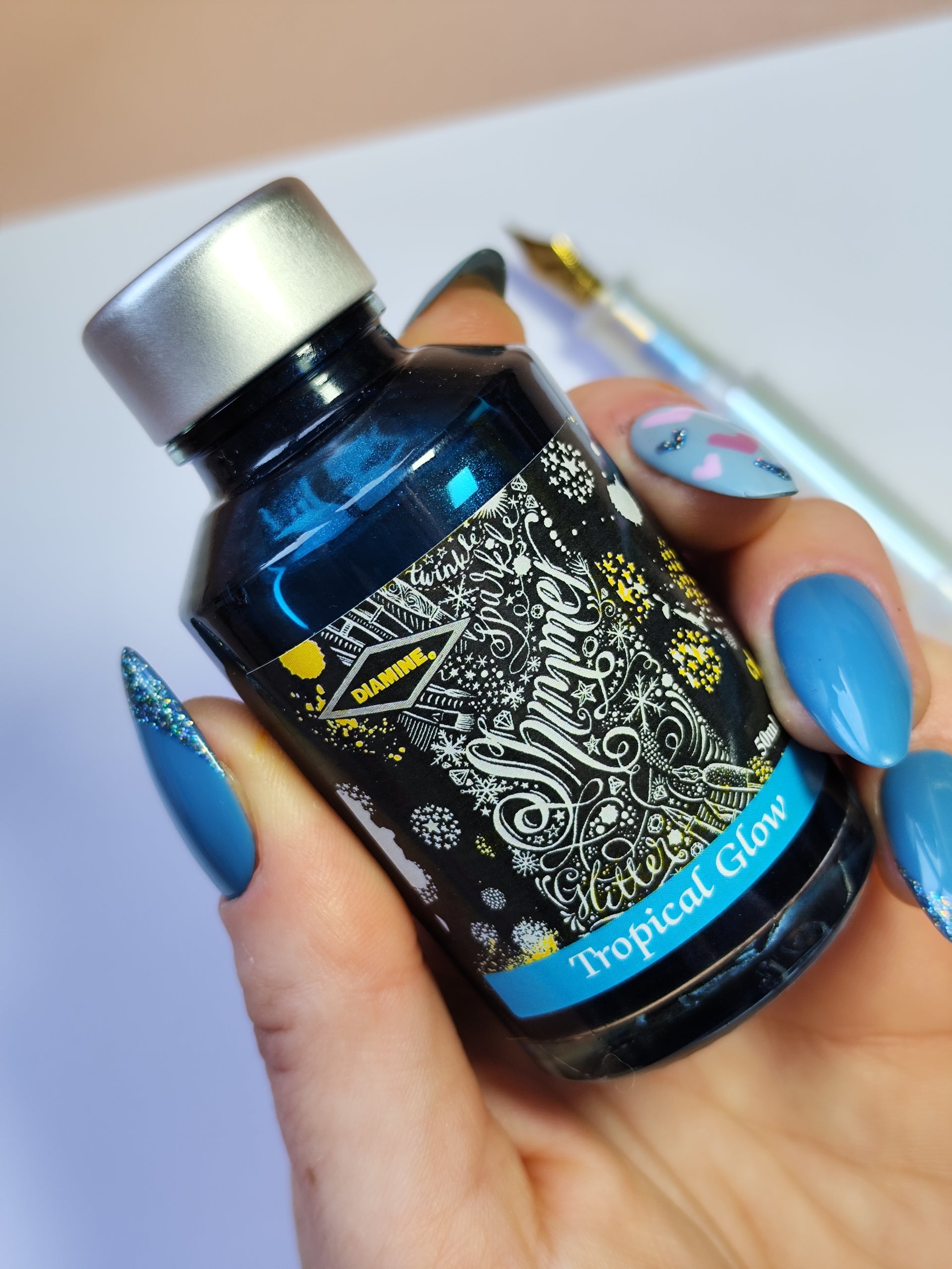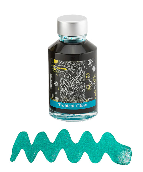 Unleash a burst of radiant colour with Tropical Glow, a captivating shimmering fountain pen ink. This 50ml glass bottle of bottled fountain pen ink offers a stunning blend of vibrant tropical green with a mesmerising golden shimmer. This ink is non-toxic and water-based, ensuring a smooth and safe writing experience. The secure screw cap ink bottle prevents leaks and keeps your ink fresh. Crafted with care and expertise, this ink is proudly made in the UK by Diamine, a brand synonymous with quality since 1864. Your writing will be elevated, transforming every stroke into a work of art.