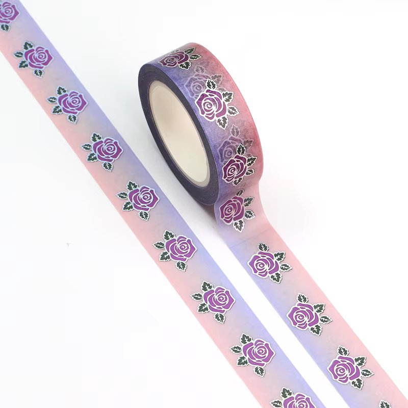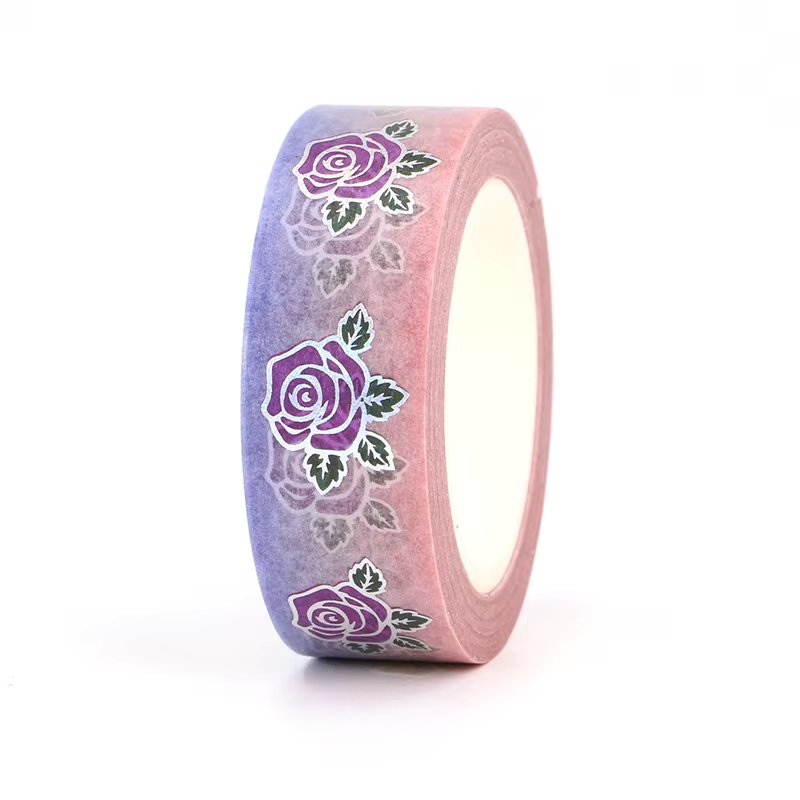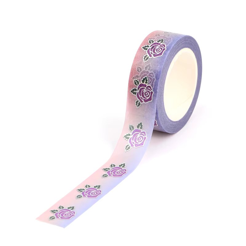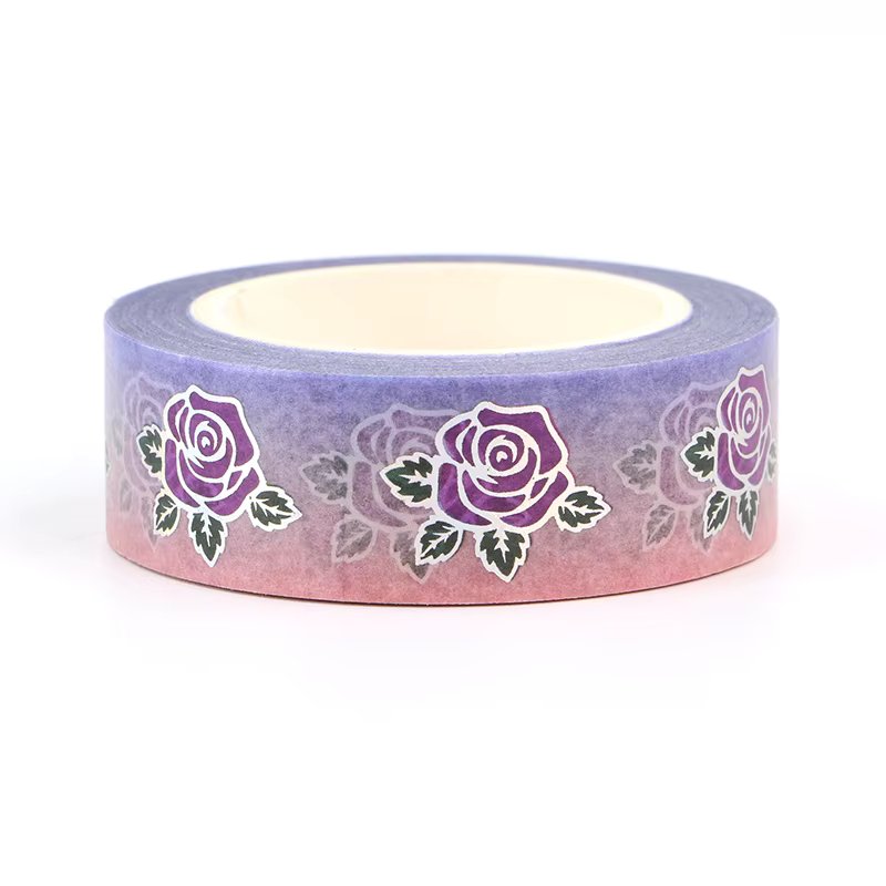 Add a flourish of sophistication to your crafts with our Silver Foil Rose Washi Tape! Featuring beautifully detailed purple roses 🌸 set against a dreamy ombre background of soft lavender and blush pink 💜💗, this tape exudes charm and elegance. The shimmering silver foil accents highlight each petal and leaf, creating a dazzling effect that’s simply unforgettable.