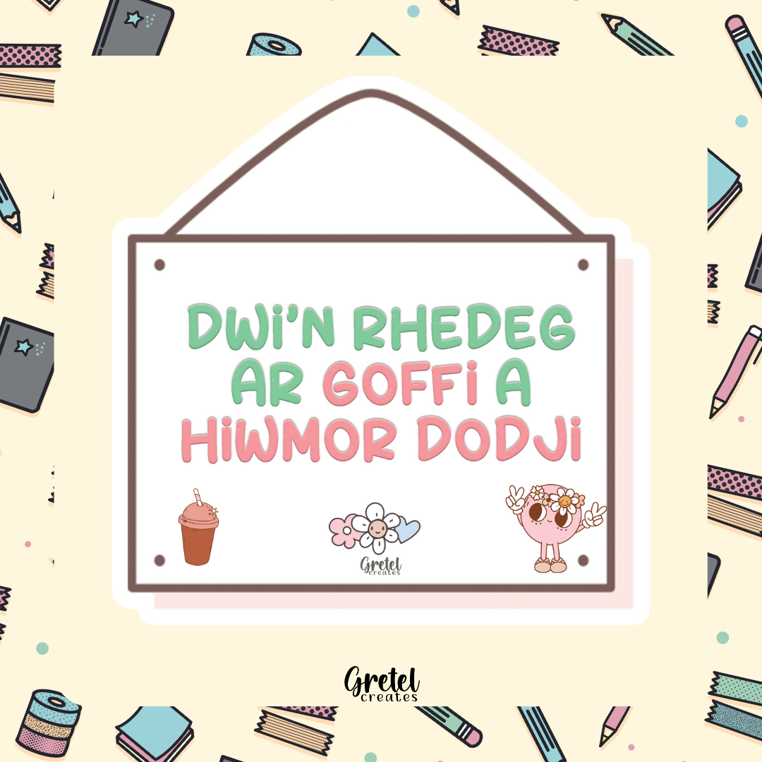 Dwi'n Rhedeg ar Goffi a Hiwmor Dodji - Sticer Cymraeg - Matte Decorative Vinyl Die Cut Sticker - Fully Waterproof