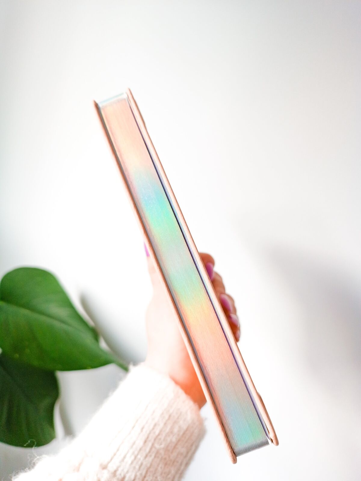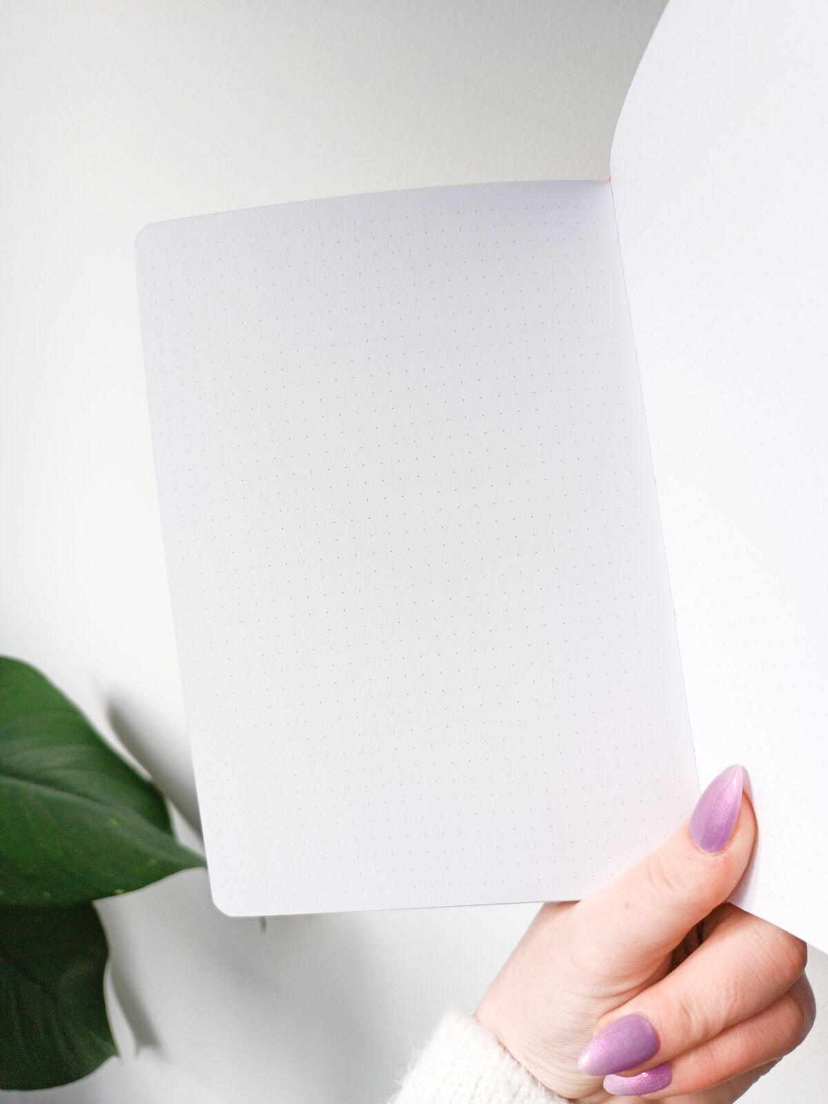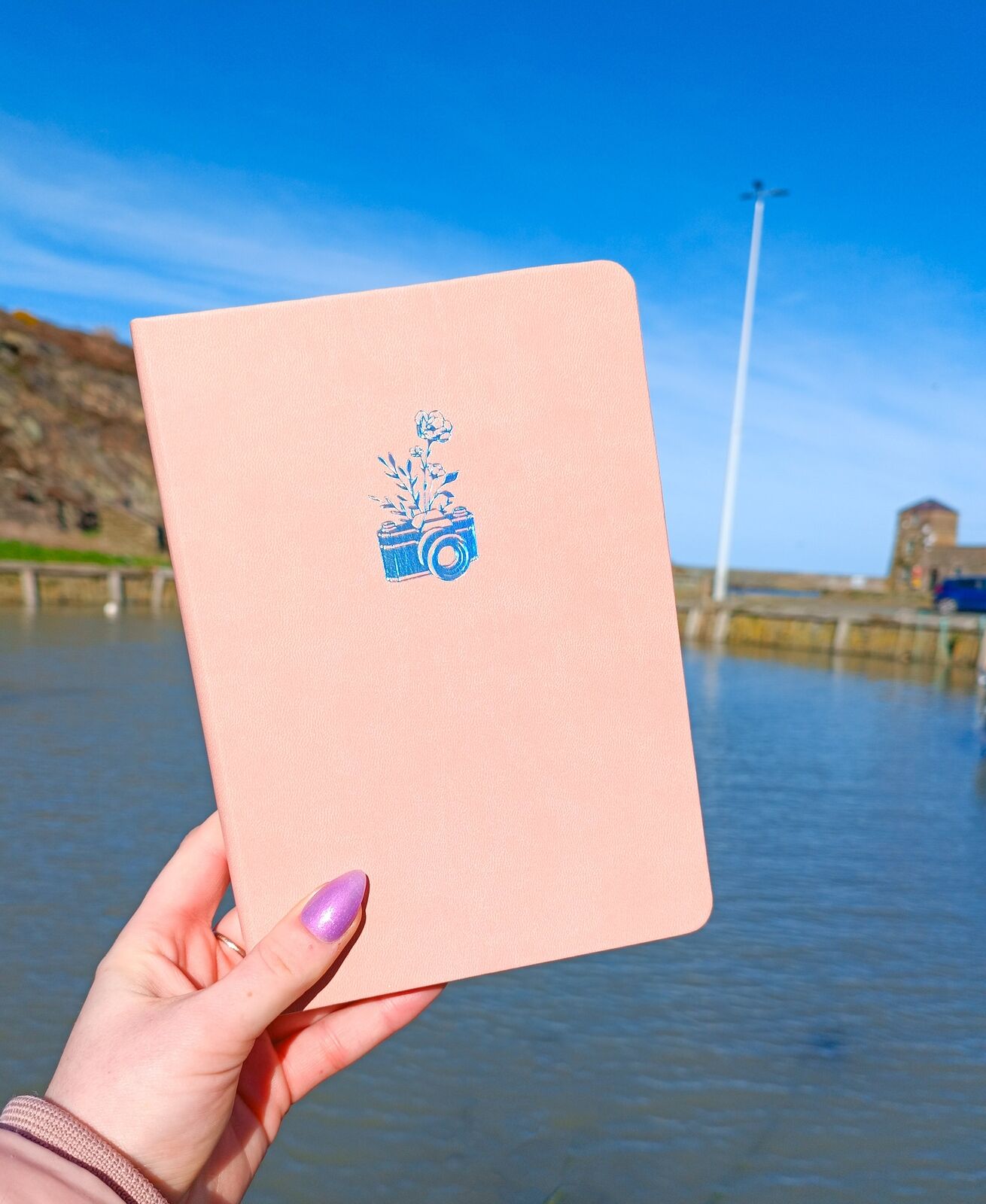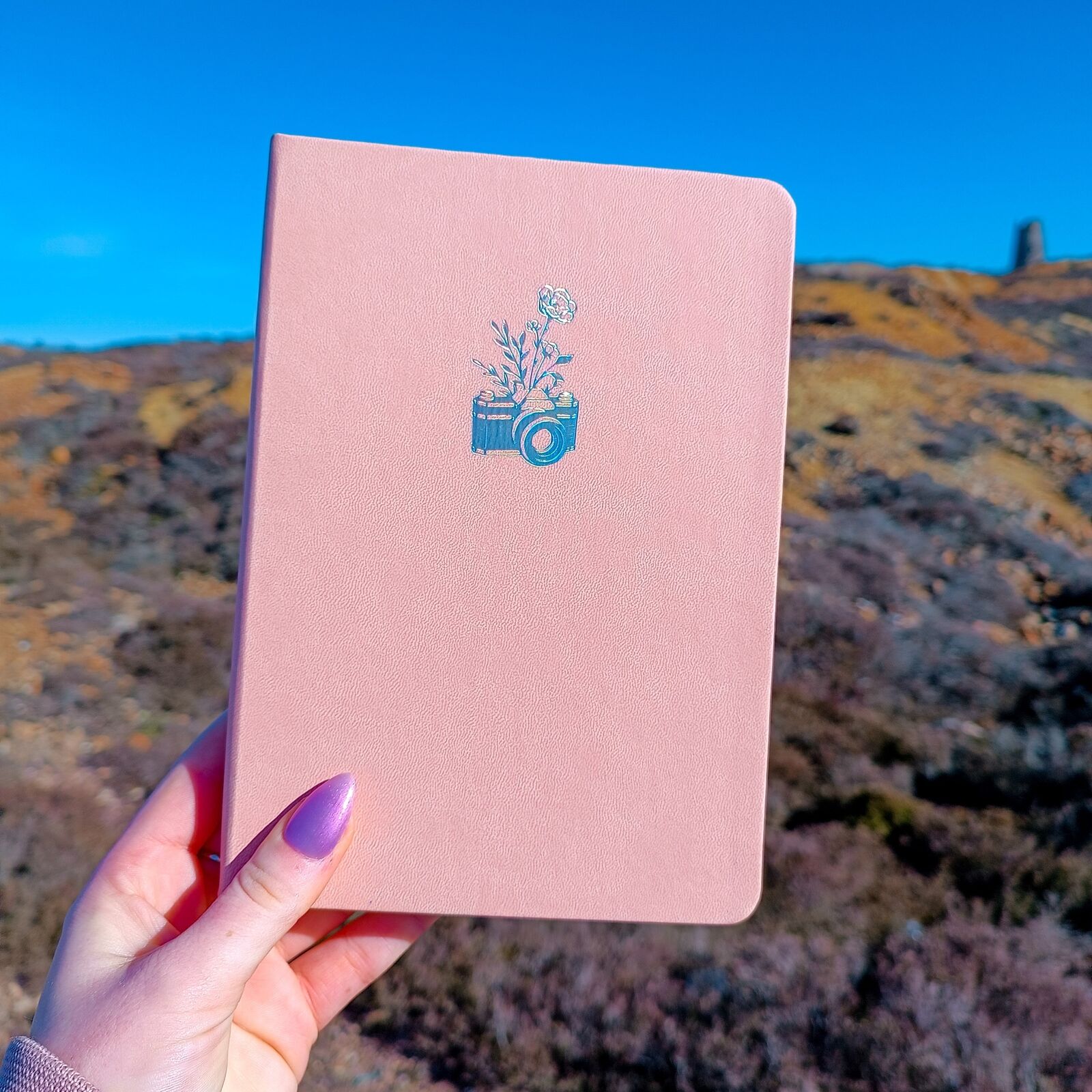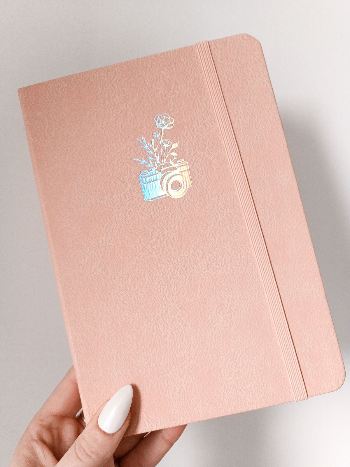 A beautiful pink A5 hardbound bullet journal with a holographic foil camera debossed cover.