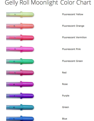 Unleash your creativity with Sakura's Gelly Roll Moonlight gel pen, available in a spectrum of fluorescent colors that beam under ultra violet light.