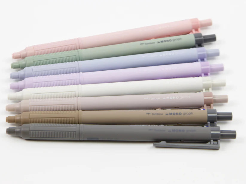 Tombow Mono Graph pen is a comfortable light weight needle-nose ballpoint pen in your choice of .38mm or .5mm tip sizes. The Mono Graph pen has a comfortable rubber grip with texture similar to a knurled pencil grip. Your choice of 8 smoky barrel colors!