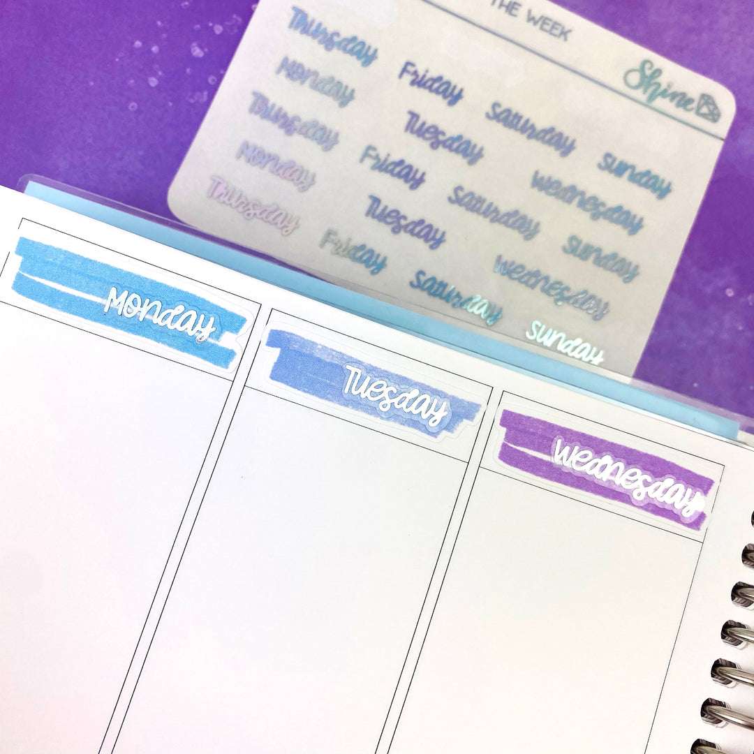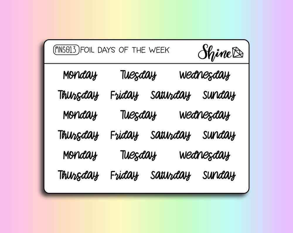 This listing is for one sheet of holo foil days of the week script stickers. There are three sets on one sheet. This sticker sheet is actually the perfect size to fit inside of the Extra Gum containers! Collect more mini sheets and store them in your gum container!