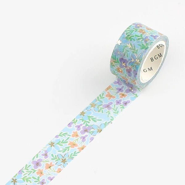 Step into a serene meadow of beauty with the Blue Flower Field Gold Foil Washi Tape by BGM! This delightful tape features dainty blue blooms scattered across a soft pastel background, enhanced with shimmering gold foil accents that catch the light like morning dew. ✨🌼