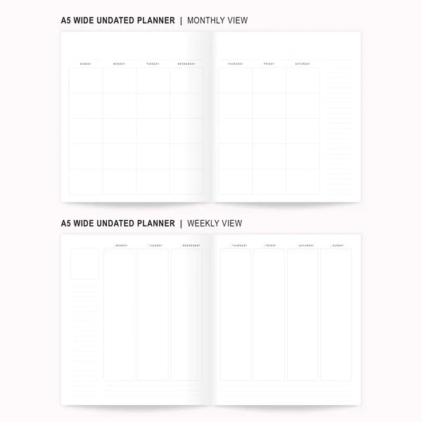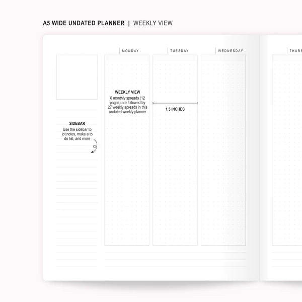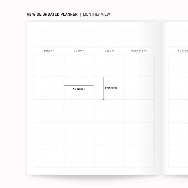 - Undated 6 months of 2-page monthly views at the start of the planner with 2-page weekly views featuring vertical daily columns that are 1.5" wide