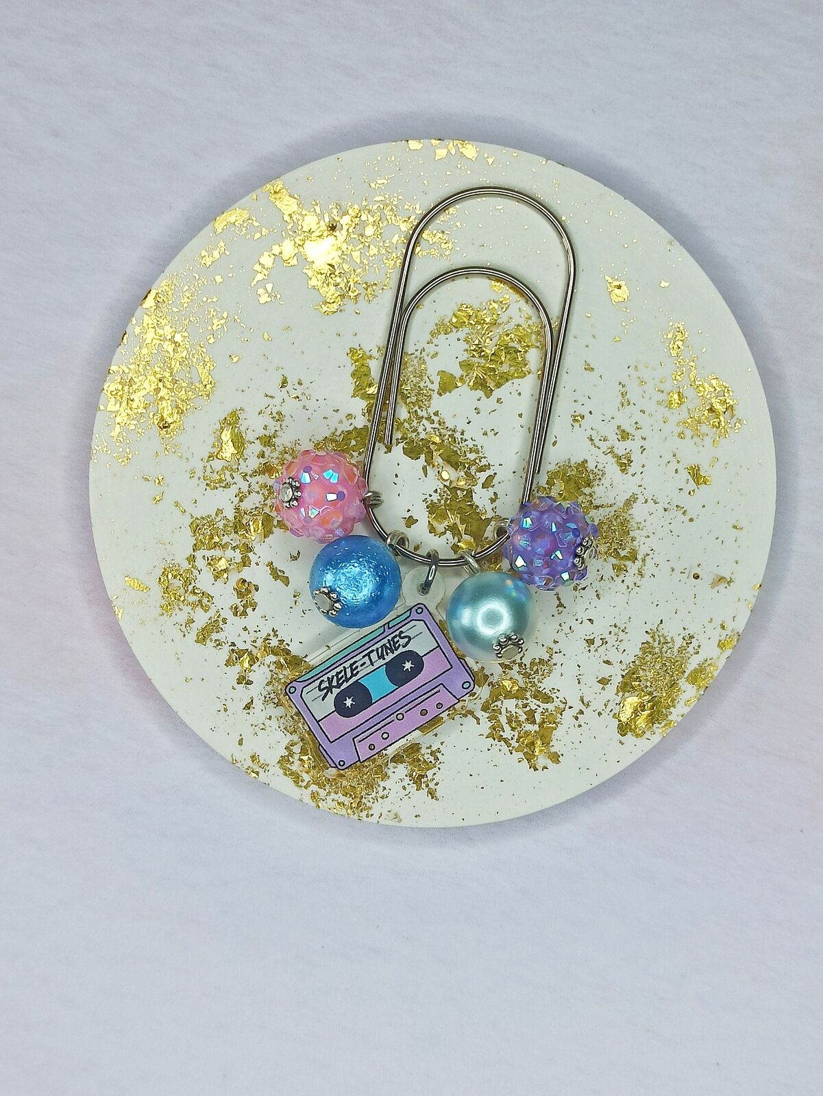 A 50mm clip fixed with acrylic charms and beads.