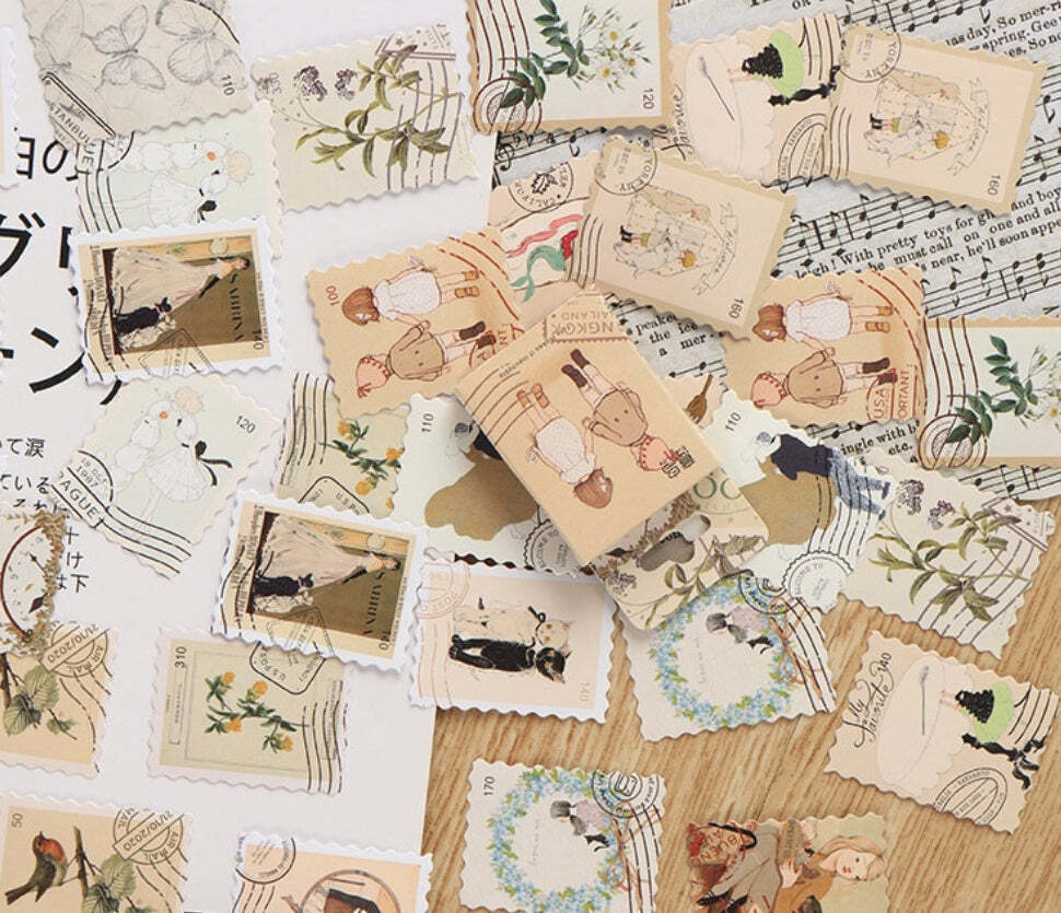 Spice up your planners, journals, scrapbooks, and crafts with these vintage-style whimsical stamp journal sticker flakes.
