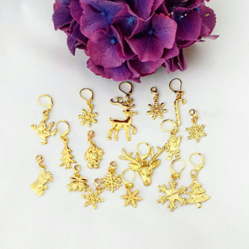 An essential tool for knitters and crocheters alike, this set consists of 5 random gold Christmas themed stitch markers on your choice of fixing.