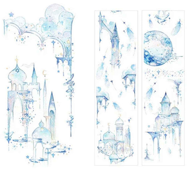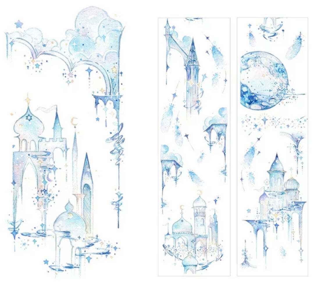 Whimsical Design: Features a beautiful watercolor-style pattern of floating castles, celestial spheres, and delicate stars in soft pastel shades.