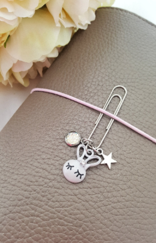 A 50mm clip fixed with an enamel rabbit, silver star and faux druzy charm.