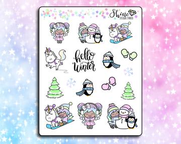 This listing is for one sheet of these adorable character and doodle stickers. This sheet features Luna with dark skin tone, a hand-drawn character, with other elements from our "Whimsical Winter" kit. The sheet includes 16 stickers total.