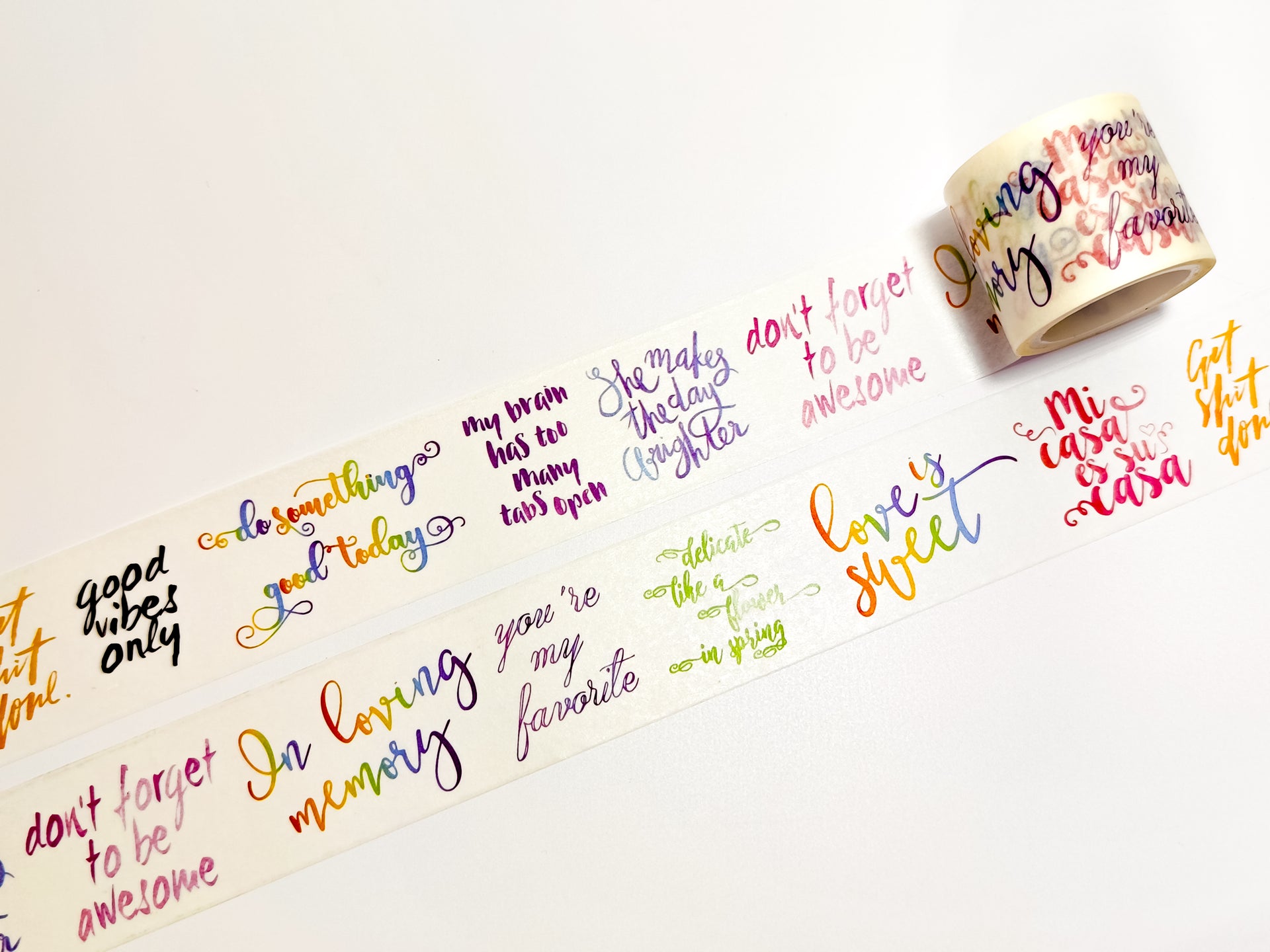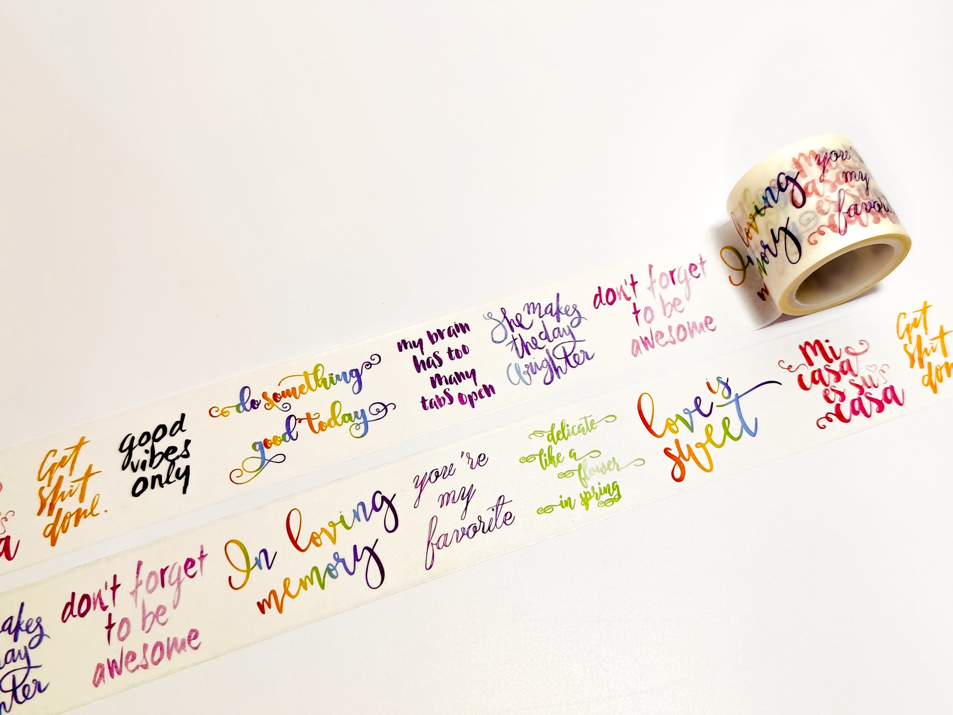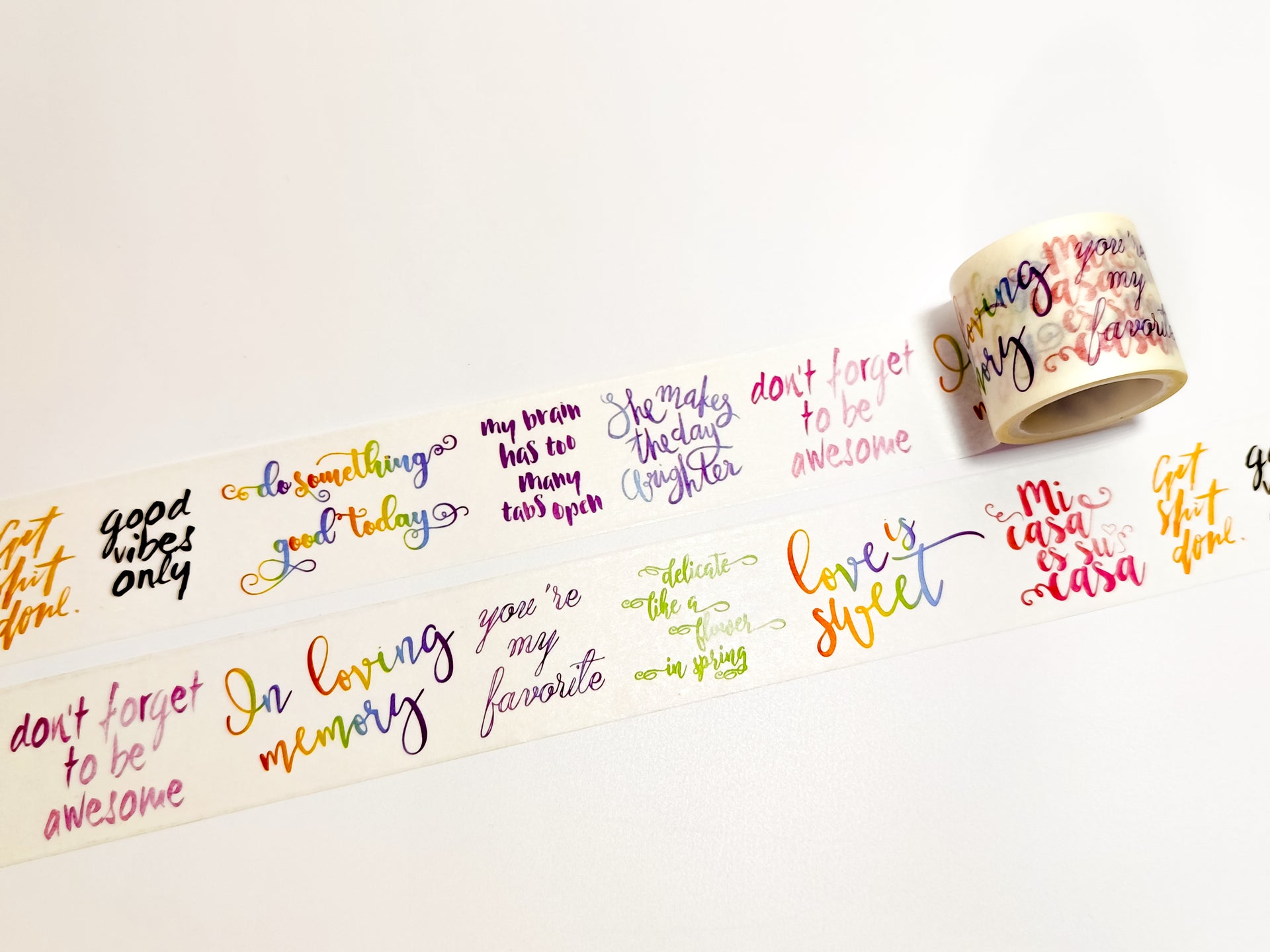 Add a pop of color and positivity to your projects with this 30mm wide washi tape. Featuring handwritten affirmations like "Get shit done," "good vibes only," and "don't forget to be awesome," this tape is perfect for junk journaling, scrapbooking, and planners.