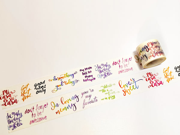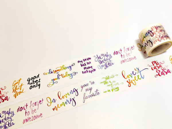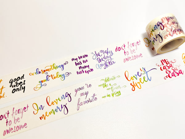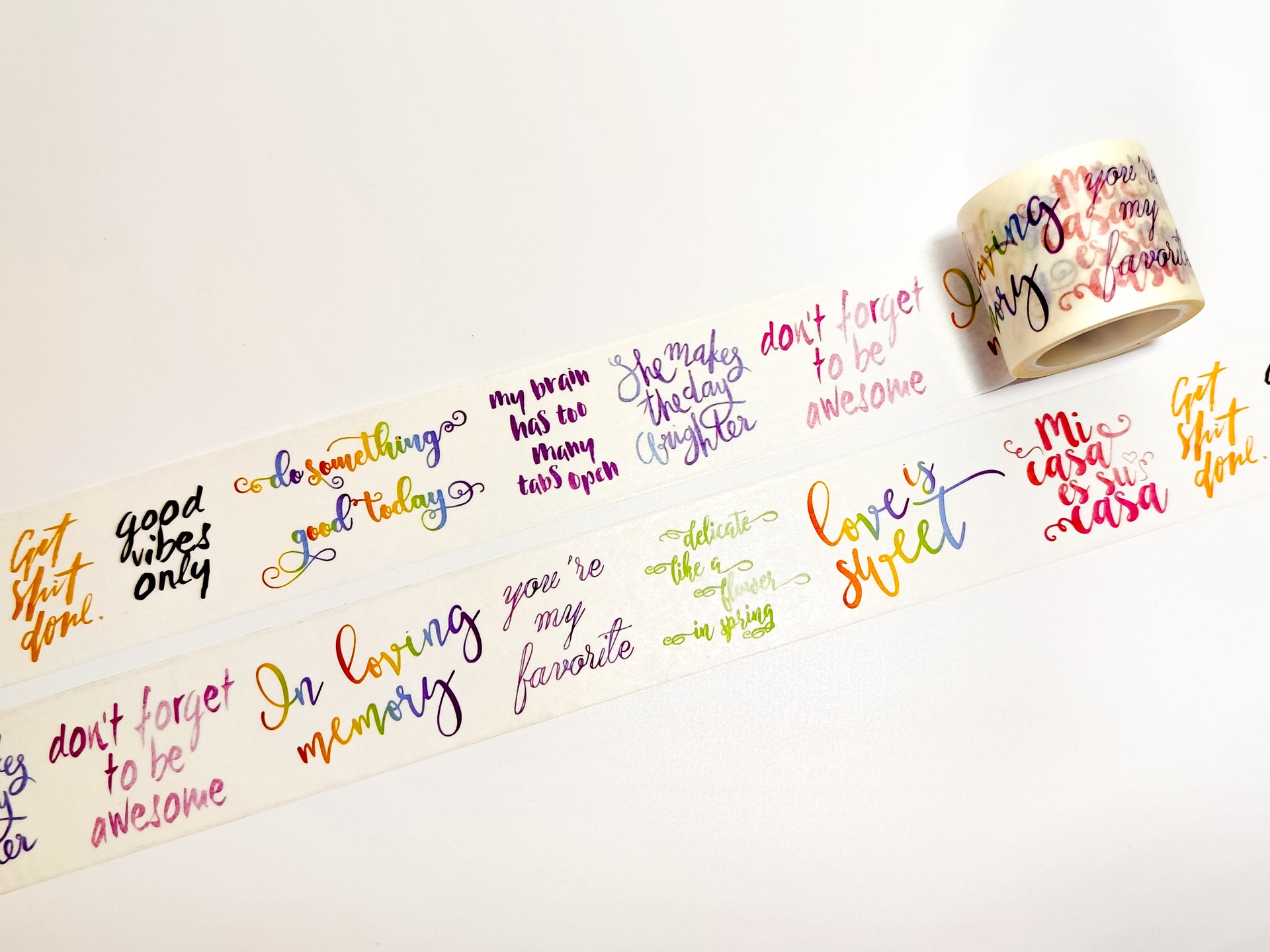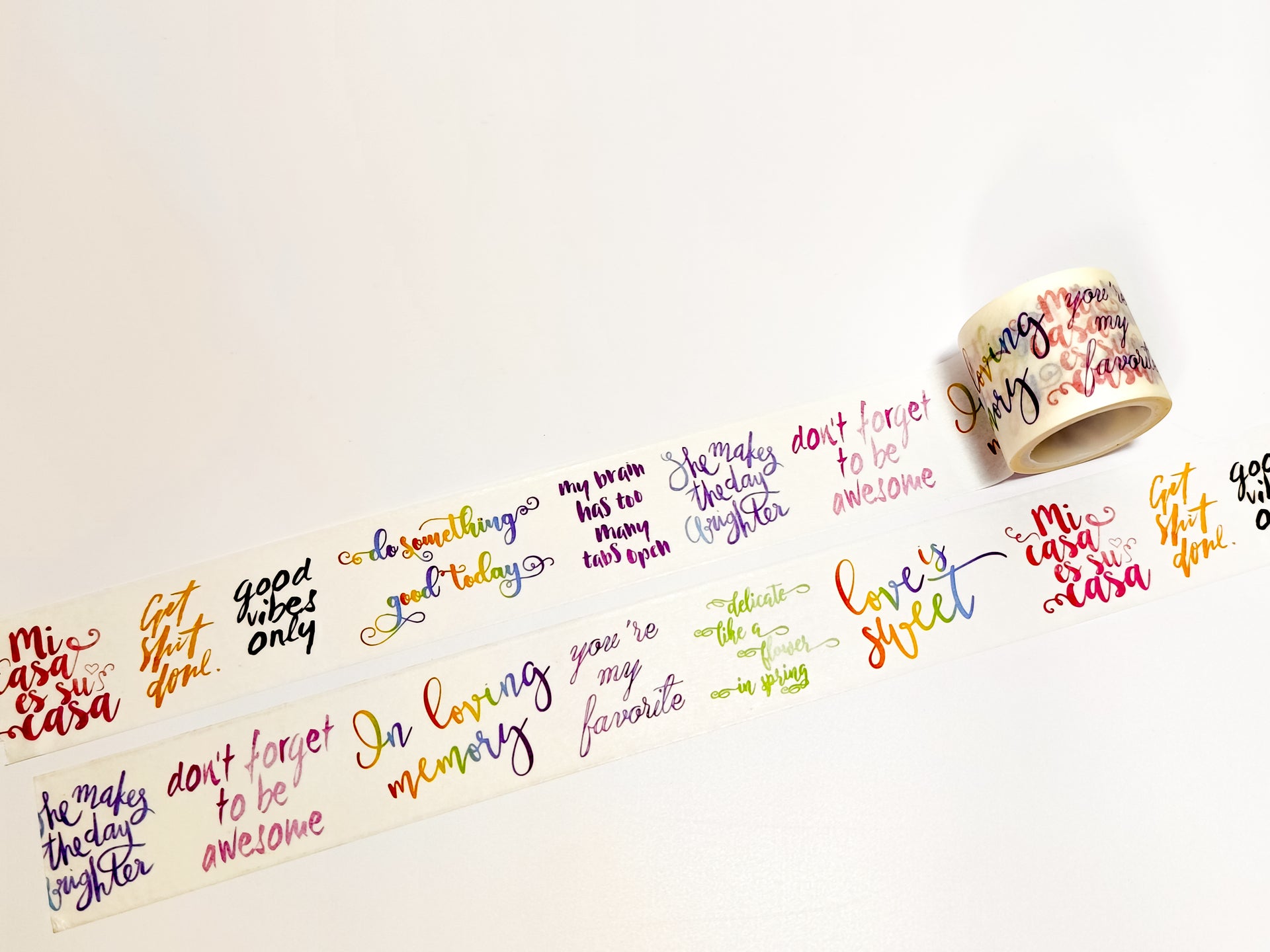 Add a pop of color and positivity to your projects with this 30mm wide washi tape. Featuring handwritten affirmations like "Get shit done," "good vibes only," and "don't forget to be awesome," this tape is perfect for junk journaling, scrapbooking, and planners.