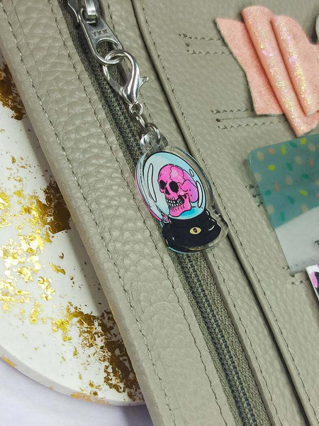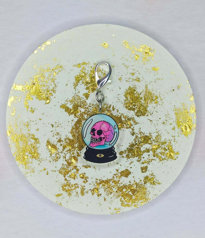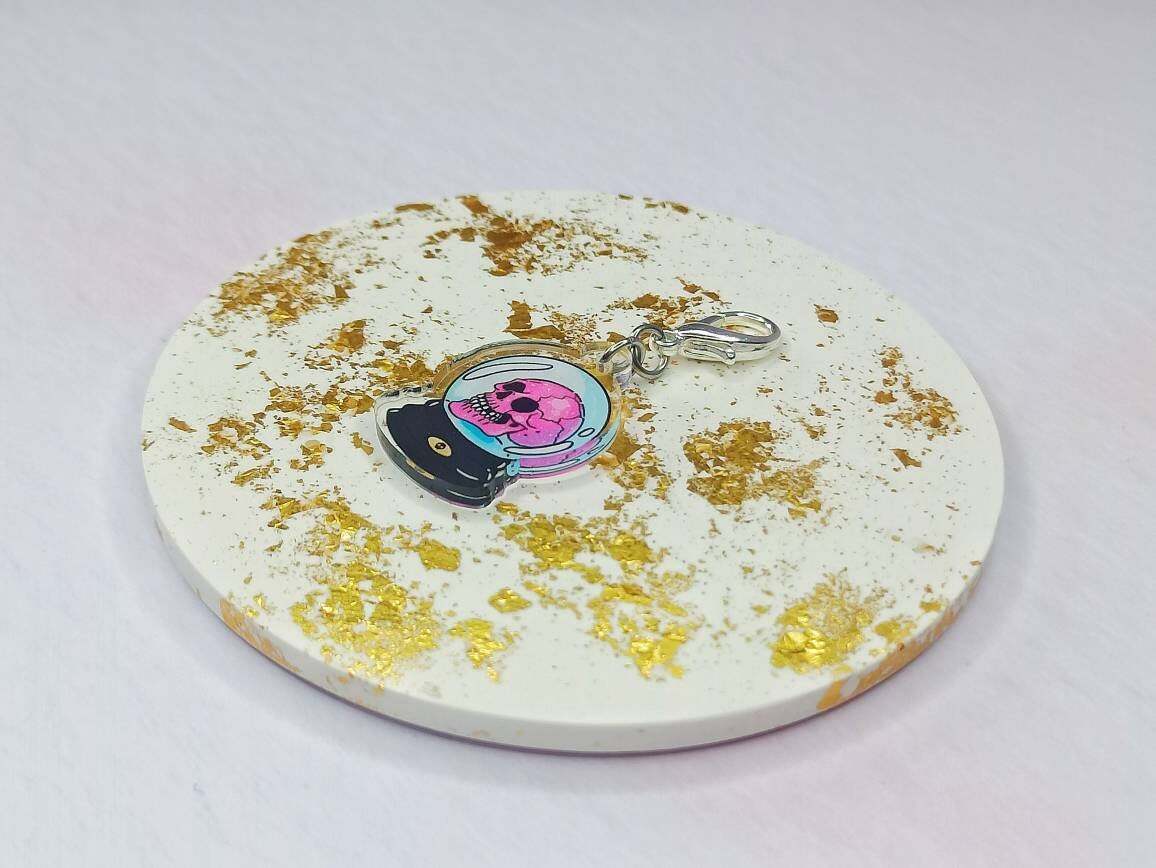 A lightweight acrylic charm afixed to a 16mm lobster clasp.
