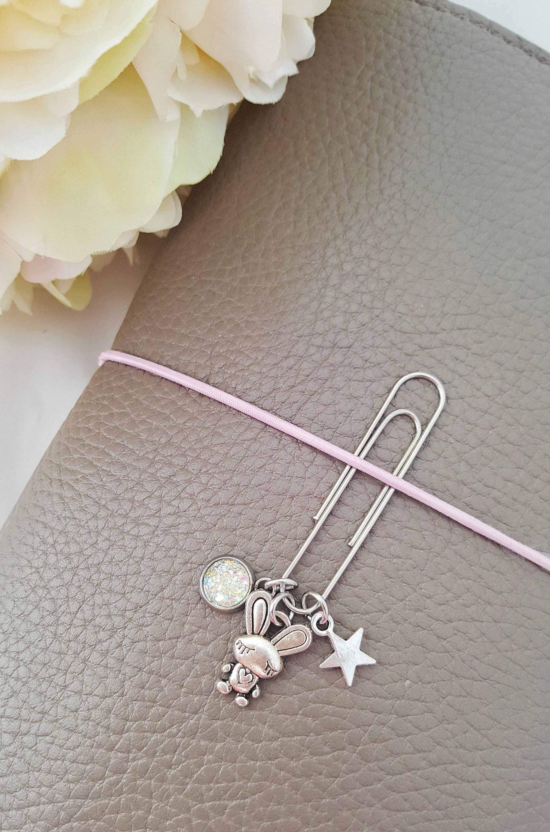 A 50mm clip fixed with a silver rabbit and star charm and a faux druzy.