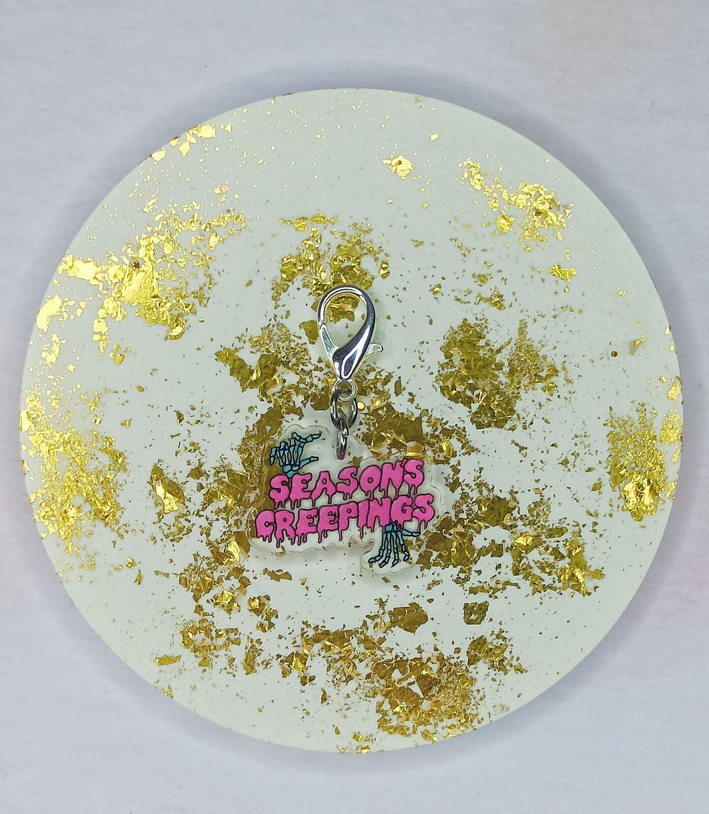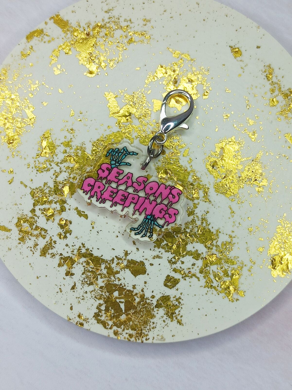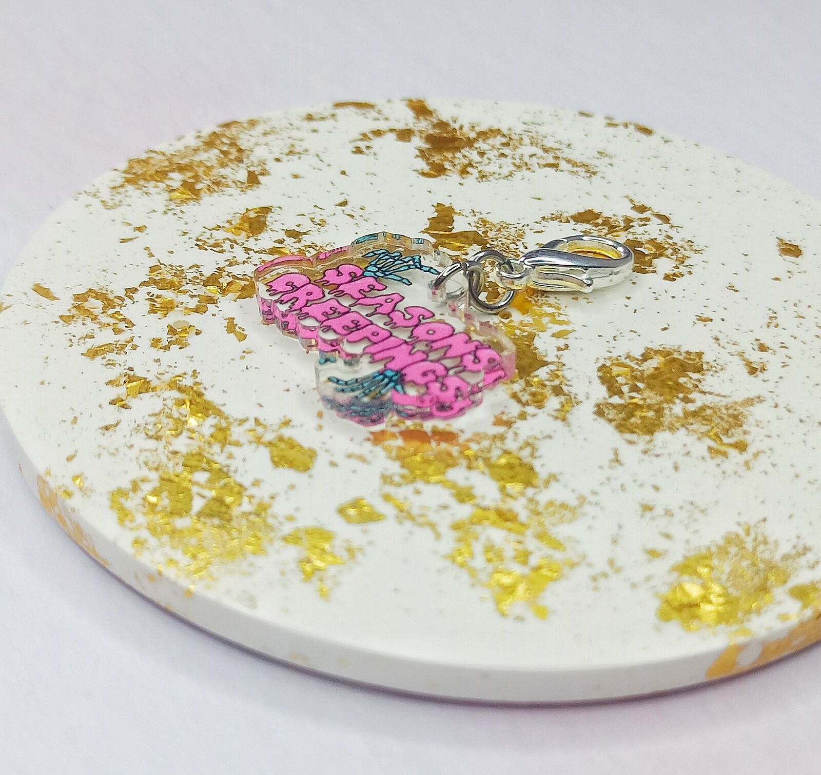 A lightweight acrylic charm afixed to a 16mm lobster clasp.