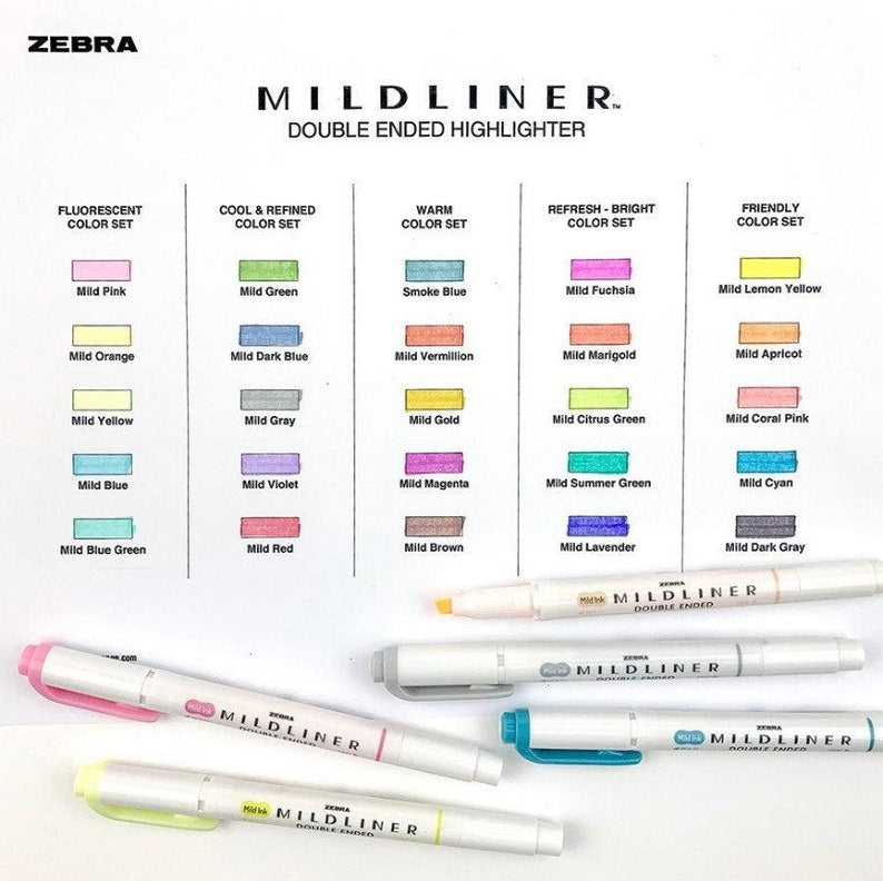 Zebra Mildliners feature a unique mild colour that shows up softly on paper and a broad and fine point tip for all hand lettering and marking applications.